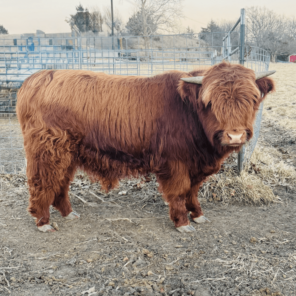 Echo Valley Fancy is a compact, chondro-positive high percentage Highland heifer with tremendous hair and a striking presence. She has a sweet, playful disposition and carries the kind of fluffy Highland character many breeders look for.