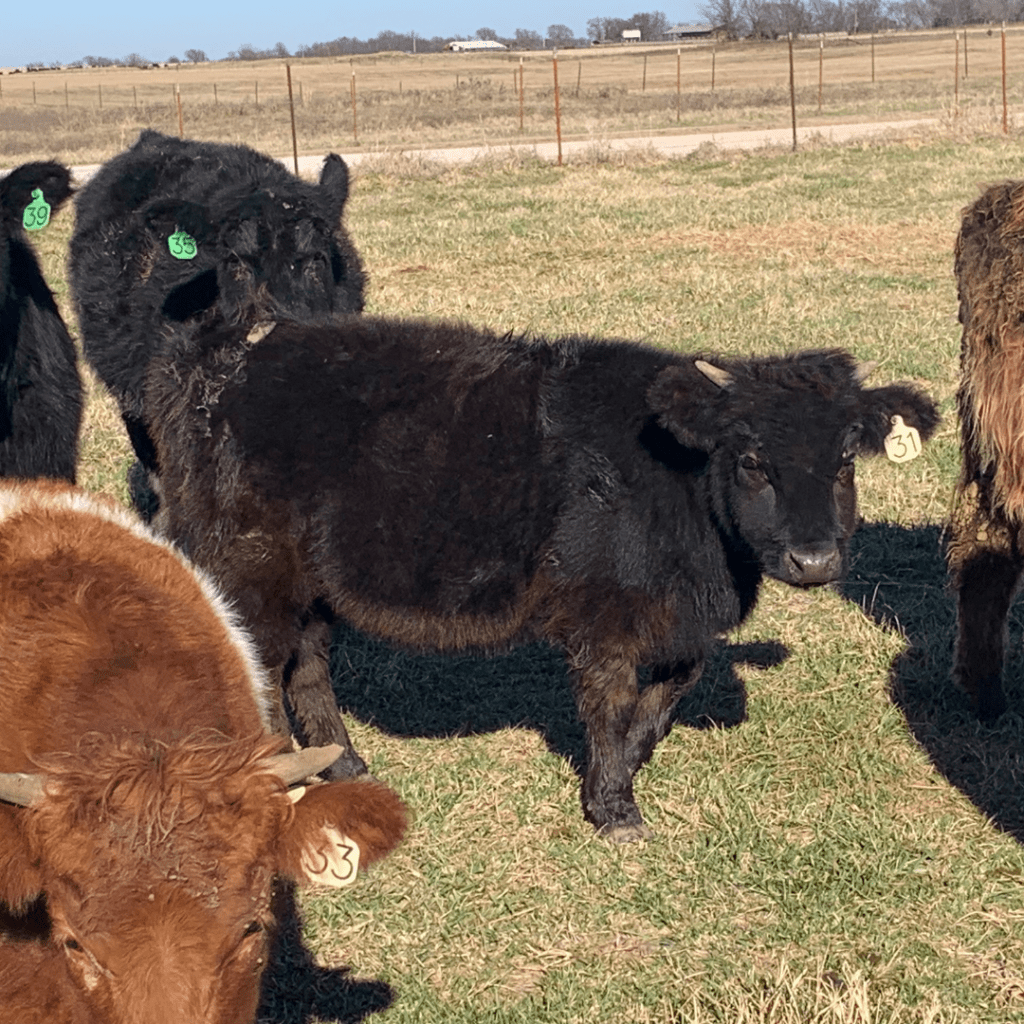 Macie is a small framed black HighPark and Dexter cross heifer that is chondro-positive and still very small for her age. She is expected to mature well under 40 inches, making her a strong fit for a miniature or boutique breeding program.
