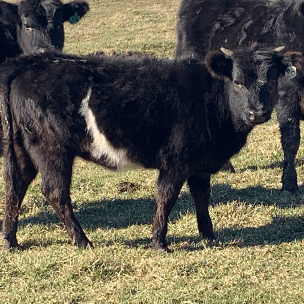 Moon Pie is a miniature HighPark cross heifer with a striking black coat and partial belt. She is a smaller framed female and is expected to mature under 40 inches, making her a good fit for a miniature or boutique program.